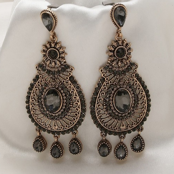 Black contemporary drop earrings, gold-plated, has artificial stones